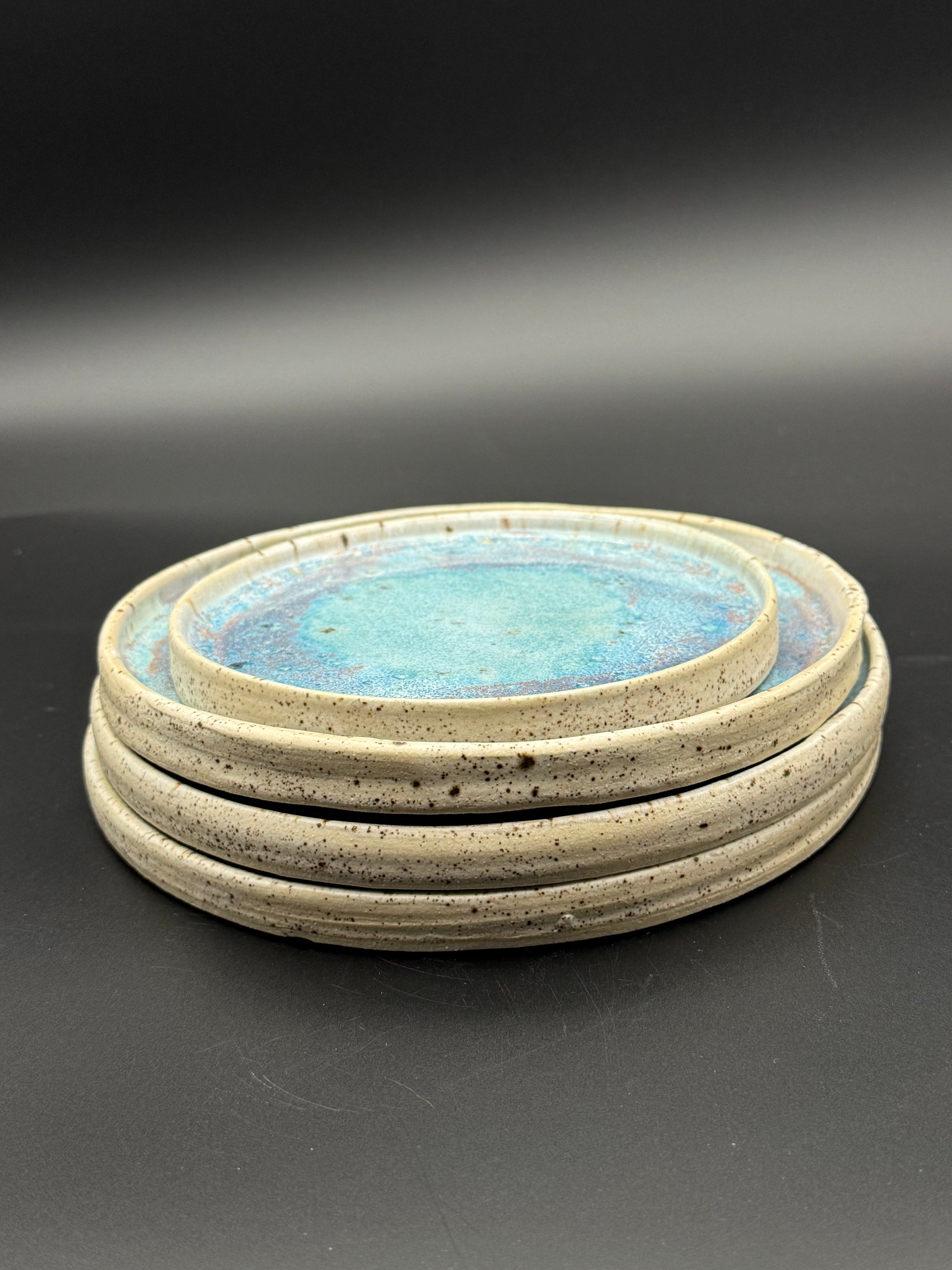 This artisanal plate set features hand-thrown stoneware crafted with precision and finished in a beautiful glaze. The collection includes three large plates and one smaller accent piece, each piece individually formed for subtle variations in character. Constructed from durable stoneware, these plates withstand everyday use and are both microwave and dishwasher safe for convenient care. Additional plates are available through custom order to expand your set. Perfect for those who appreciate functional ceramics with authentic handmade appeal.