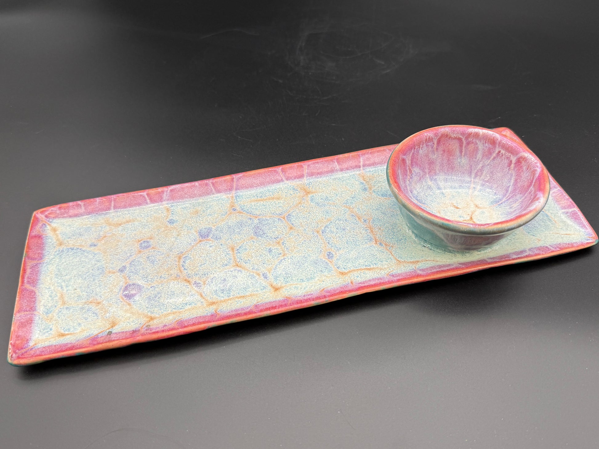 This hand-thrown ceramic sushi tray combines functional design with artisanal quality. Each piece is individually crafted and finished with hand-applied glaze, featuring a spacious tray paired with a matching sauce bowl. The distinctive pink glaze captures the serene essence of a frozen pond. While dishwasher safe for convenience, hand washing is recommended to maintain the glaze's finish and ensure lasting durability. A refined addition for discerning collectors and sushi enthusiasts alike.